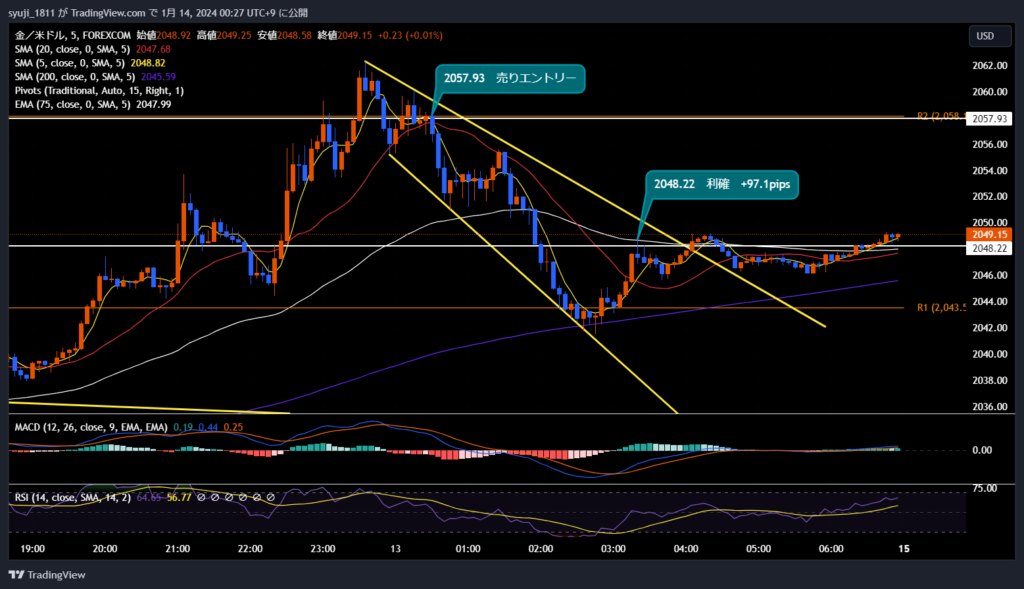4時間足以下は上昇トレンドだったがレジスタンスラインを完全に上抜けできなかったため超短期目線で売りエントリーした。